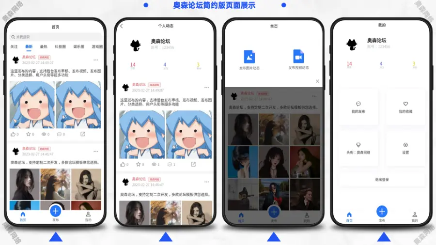 1.支持用户头衔审核、视频文章发布、帖子发布、二级回复功能