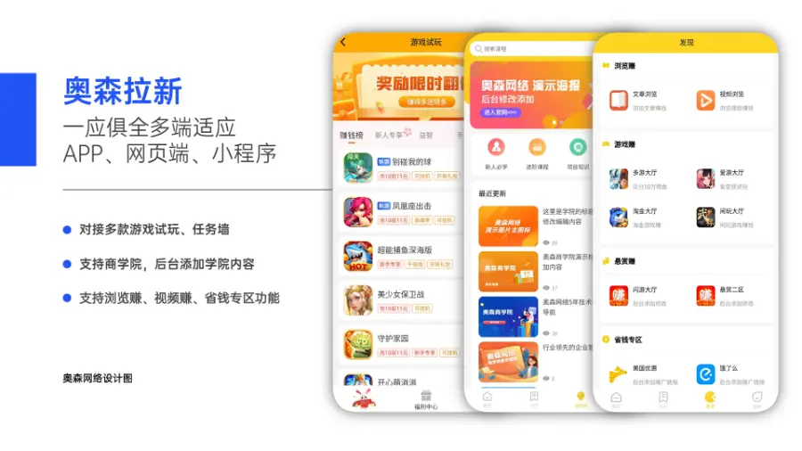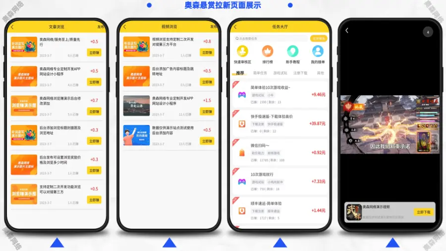 4.对接多款游戏试玩、多款任务联盟、支持视频浏览、文章浏览、省钱专区等内容,后台添加相关内容,也可以关闭或者增加相关栏目