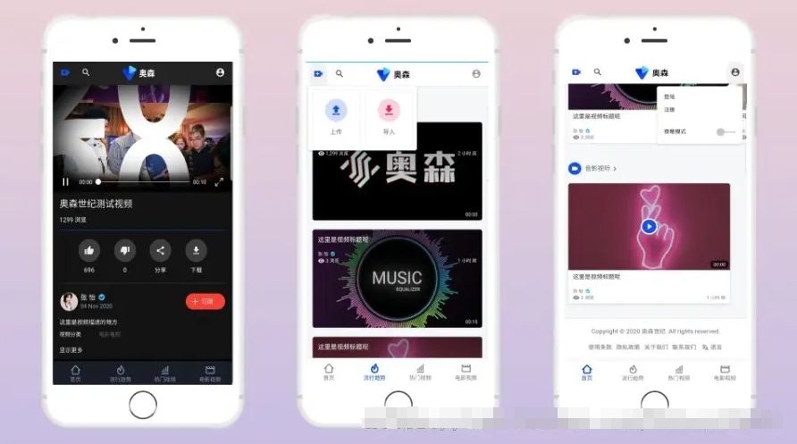 文章发布-私人/公开视频-视频上传审核-会员模式-视频分配率自动配置-视频自动获取封面-支持https-播放器水印-视频下载按钮-支持FFMPEG-支持视频格式-mp4/mov/webm/mpeg/3gp/avi/flv/ogg/mkv/mk3d/mks/wmv