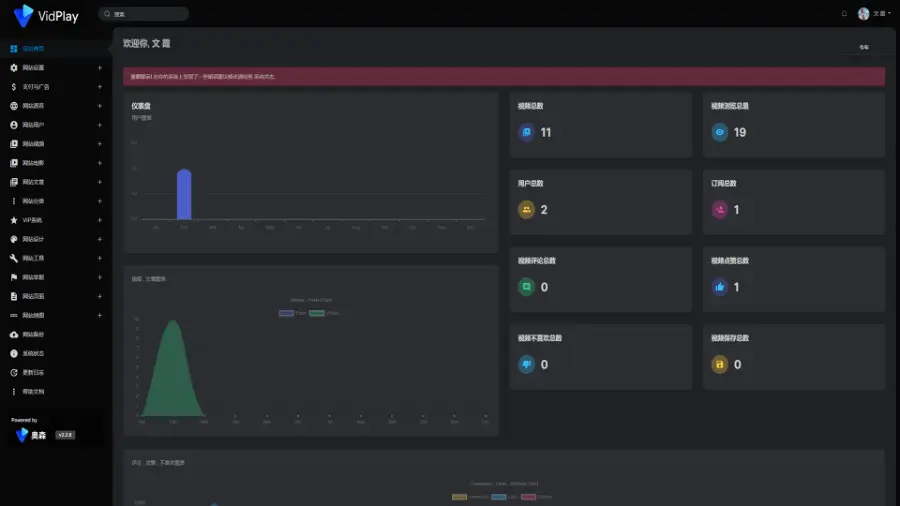 此源码是一款视频网站系统,你可以用这个来快速搭建自己的视频网站,安装简单、界面简洁、易于使用。用户可在网站上面注册登陆上传视频、发布评论与收藏视频,系统带护眼模式,有利于保护眼睛,与此同时提供了后台管理,管理员可以进行网站名称,logo等设置。网站采用响应式设计,因此不论你在什么设备浏览网站,都有非常好的体验。