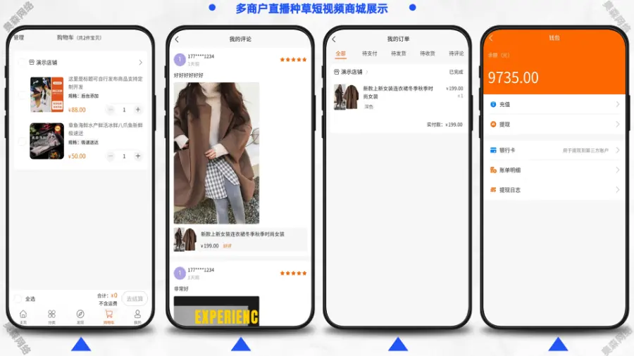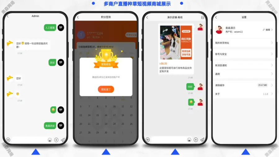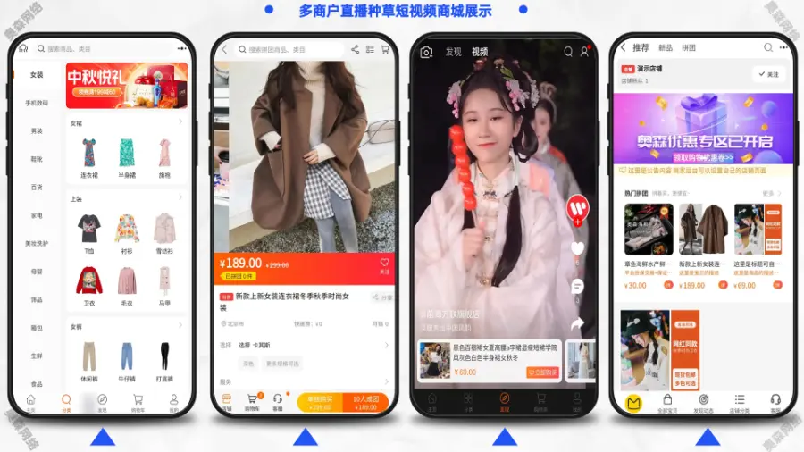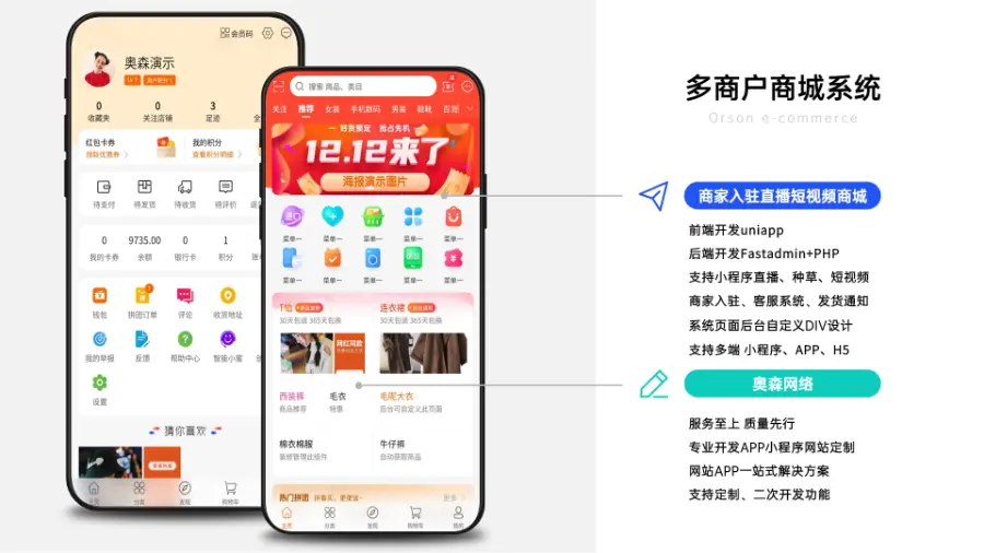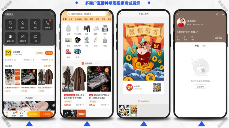 多用户商城系统拥有多种运营模式B2B2C/B2C,内置独立商家后台、商城装修、短视频、社区种草、全终端直播、阶梯拼团,智能客服等功能