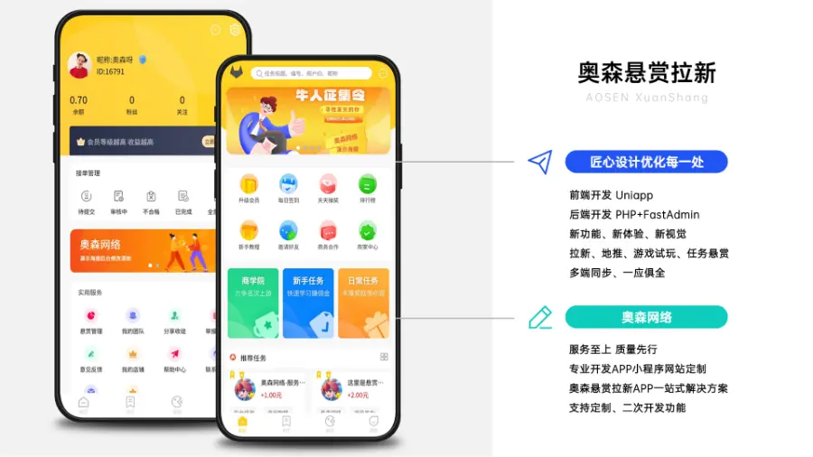 3.支持新手任务、日常任务、每日签到、排行榜新手教程、邀请好友、商务合作、联系客服等,(后台配置首页相关的文字图标及跳转地址)