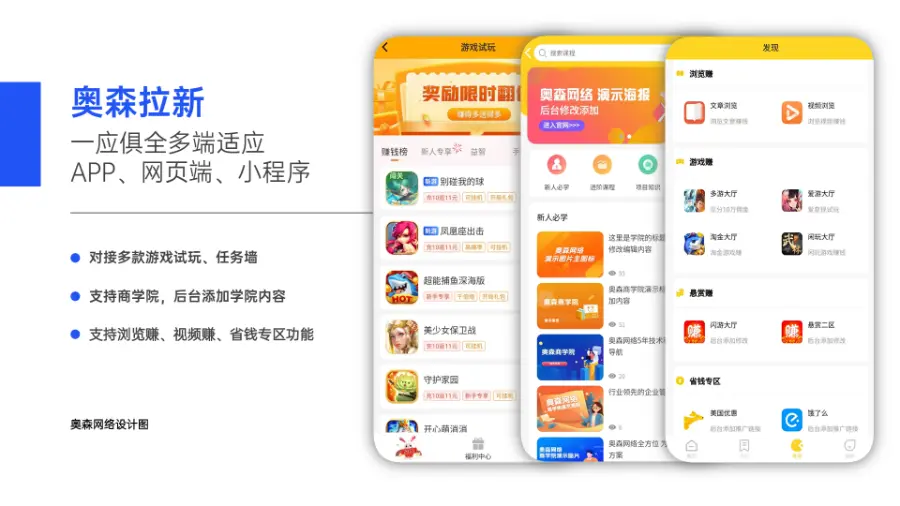 4.对接多款游戏试玩、多款任务联盟、支持视频浏览、文章浏览、省钱专区等内容,后台添加相关内容,也可以关闭或者增加相关栏目