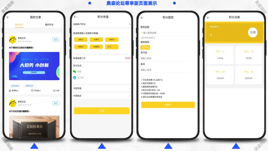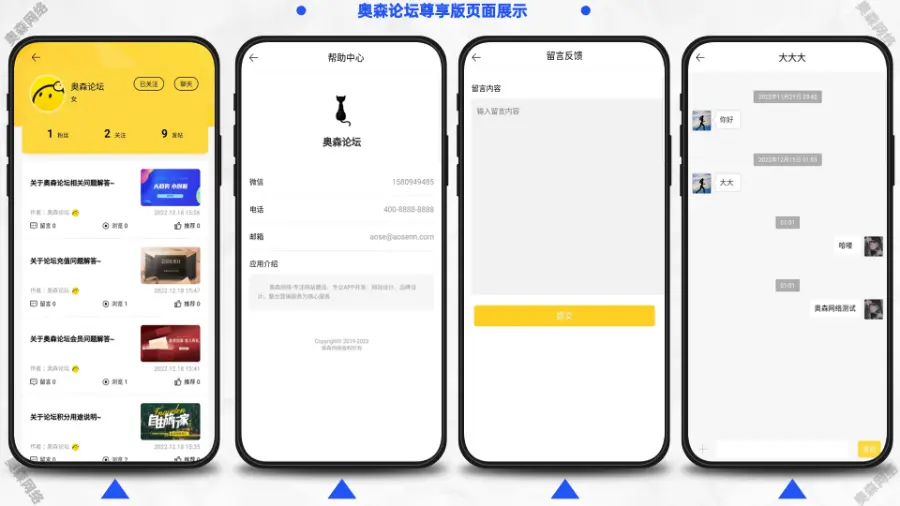 11.支持帖子打赏功能、帖子搜索功能、私密回复帖子功能、举报帖子功能、积分记录查询、留言反馈功能、帮助中心、咨询中心、头衔申请….更多功能