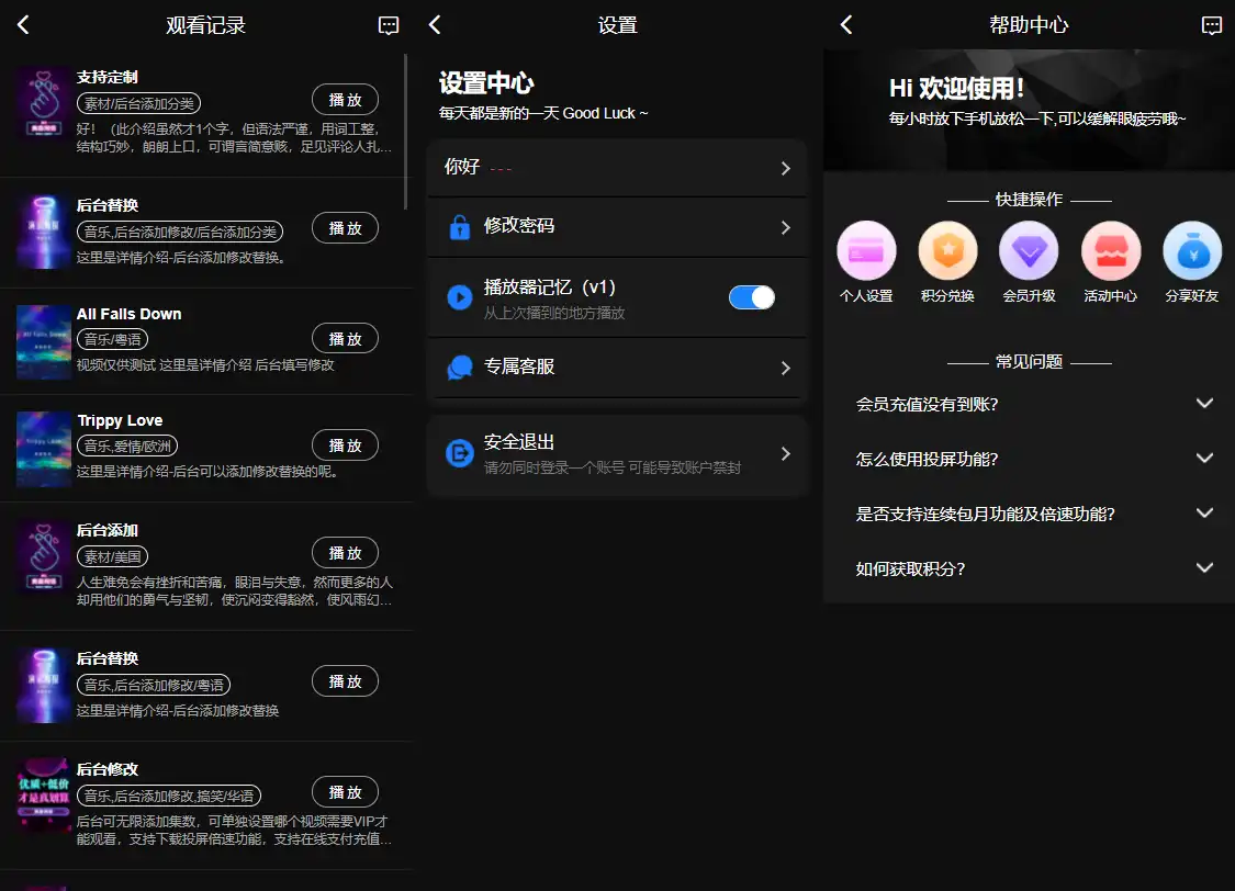 支持观看记录丶使用帮助中心丶在线客服丶留言反馈丶我的收藏丶我的下载丶在线更新丶记忆播放器