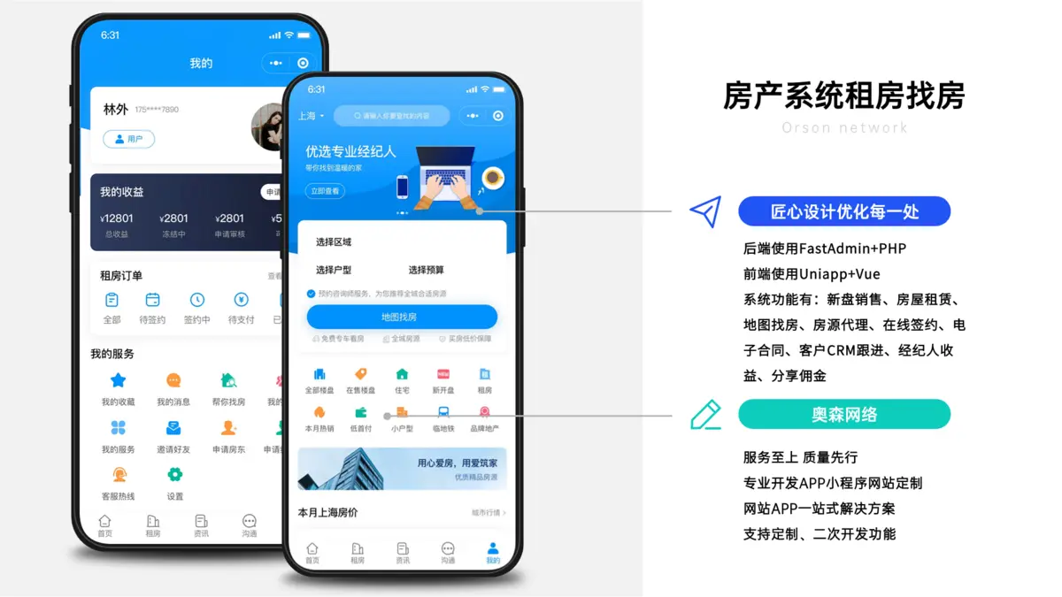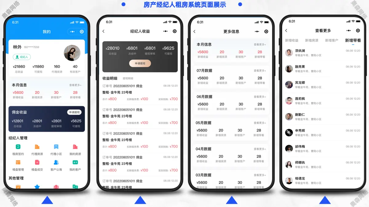 房产管理系统,支持小程序、H5、APP;包含房客、房东、经纪人三种身份。核心功能有:新盘销售、房屋租赁、地图找房、房源代理、在线签约、电子合同、客户CRM跟进、经纪人收益、分享佣金等