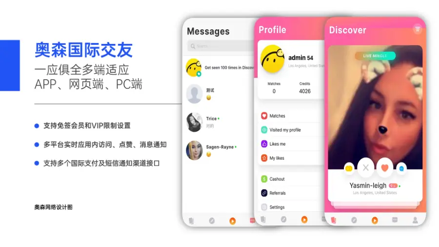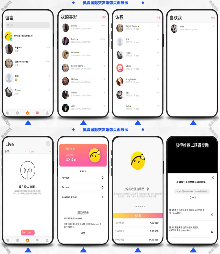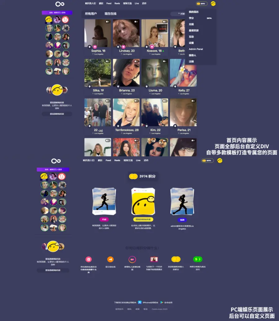 3、积分系统:后台可设置查看资料需要的积分及礼物价格的积分信息,可设置邀请几个好友赠送多少积分逻辑、可设置积分是否可以提现相关的比例可以在后台设置
