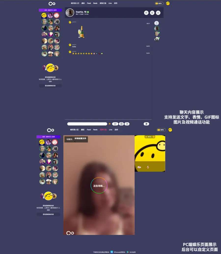 6、支持用户发布动态、短视频、聊天实时通讯、可以相互发送礼物、探索礼物、认识新的人