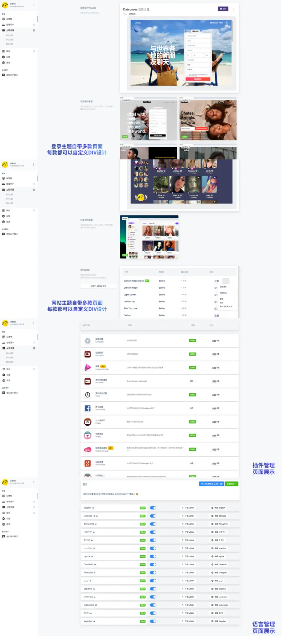 12、网站主题、手机主题、登录主题、均有多款主题后台可以随意切换使用、全部页面均可自定义DIV设计及编辑 无需修改代码即可实现在线编辑
