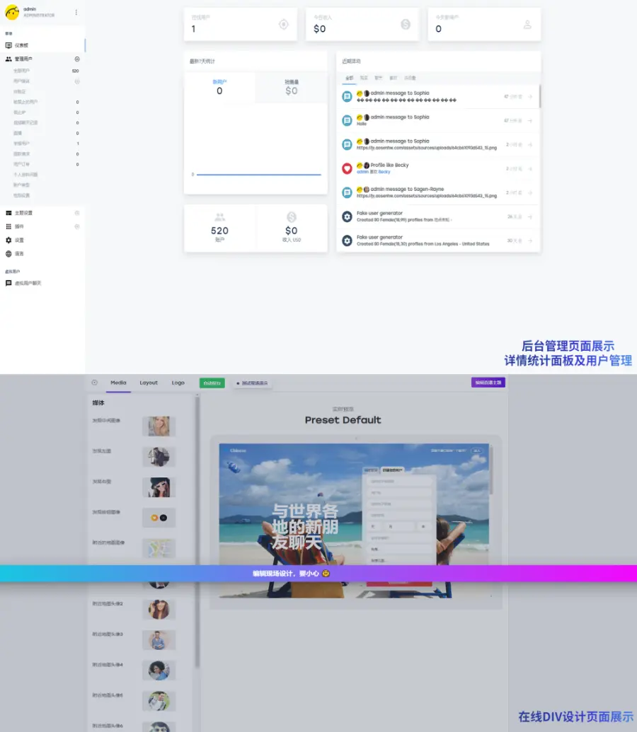 可编辑用户信息、可设置用户权限、资料信息、增加积分、开通会员、发布动态、等超多功能