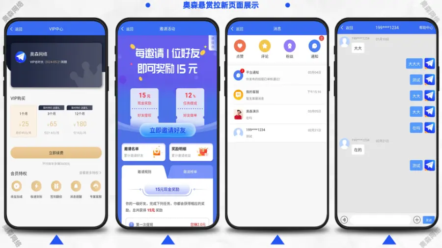 6、消息通知:会员购买通知、充值通知、提现通知、领取任务通知、提交任务通知、任务审核通知、发布任务、后台审核通知