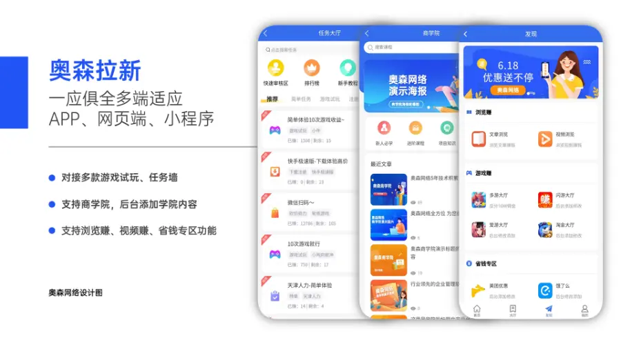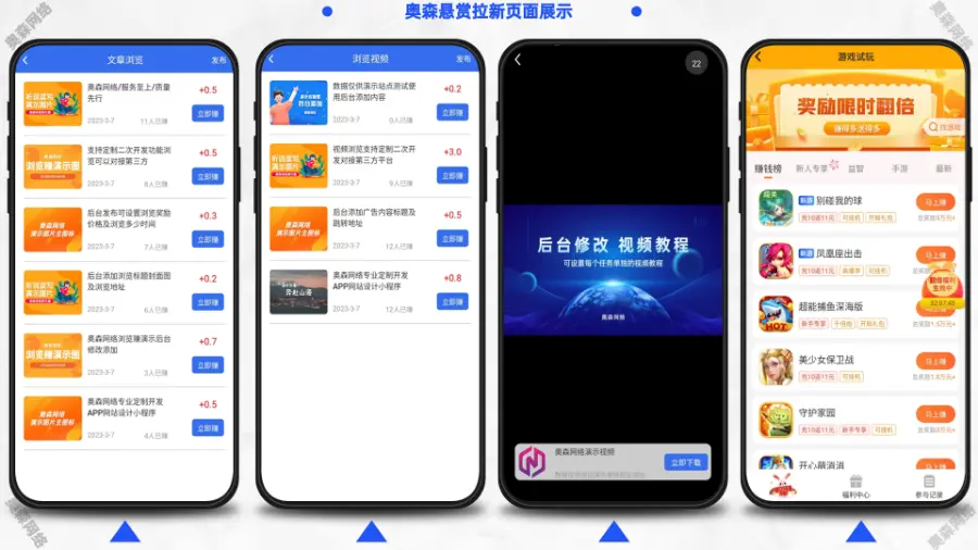 2.联盟配置:对接多款游戏试玩、多款任务联盟、支持视频浏览、文章浏览、省钱专区等内容,后台添加相关内容,也可以关闭或者增加相关栏目