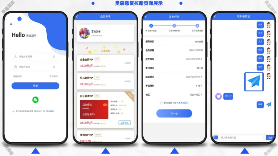 13.消息通知:会员购买通知、充值通知、提现通知、领取任务通知、提交任务通知、任务审核通知、发布任务、后台审核通知可自行添加通知