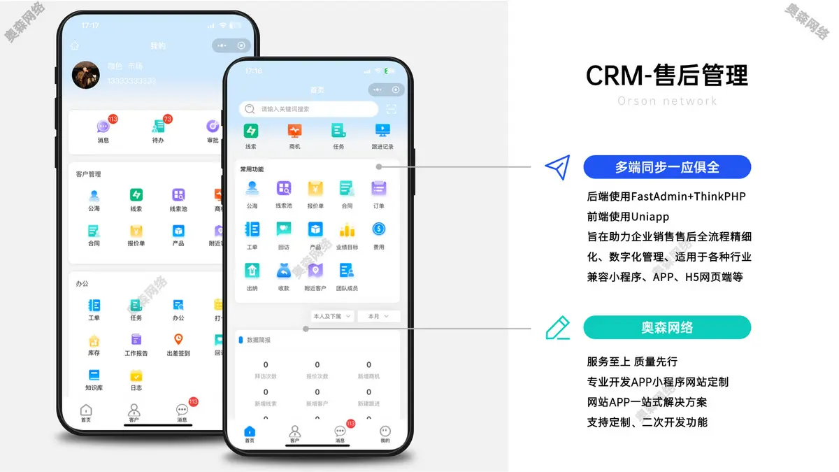 旨在助力企业销售售后全流程精细化、数字化管理,主要功能:客户、合同、工单、任务、报价、产品、库存、出纳、收费,适用于:服装鞋帽、化妆品、机械机电、家具装潢、建材行业、快销品、母婴用品、办公用品、汽配汽修、生鲜农贸、手机通讯、数码家电、医药用品、制造业、信息技术服务行业等。支持私有化部署。