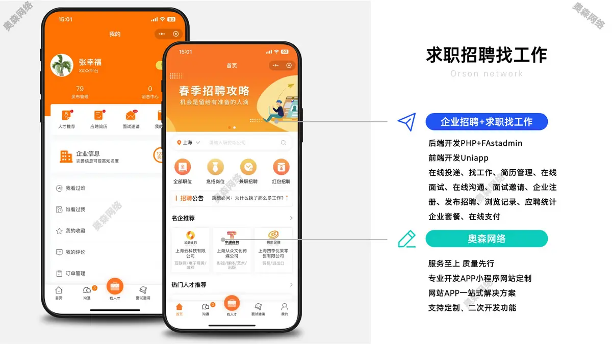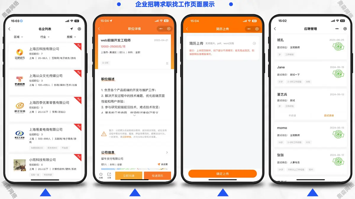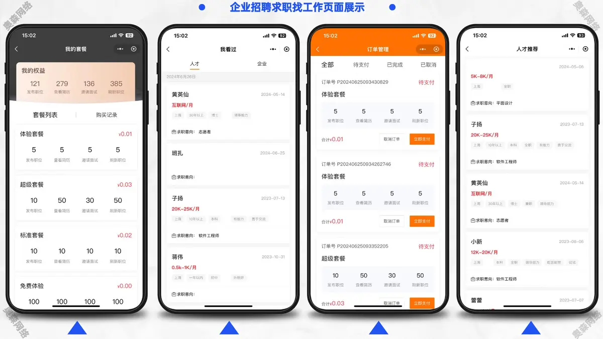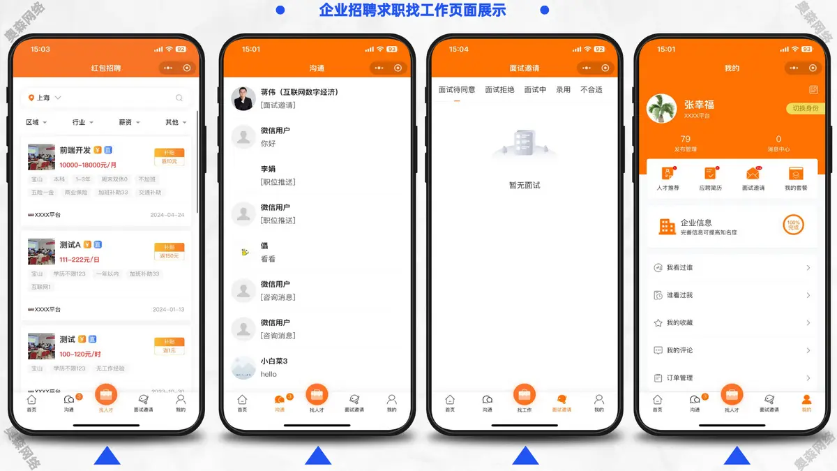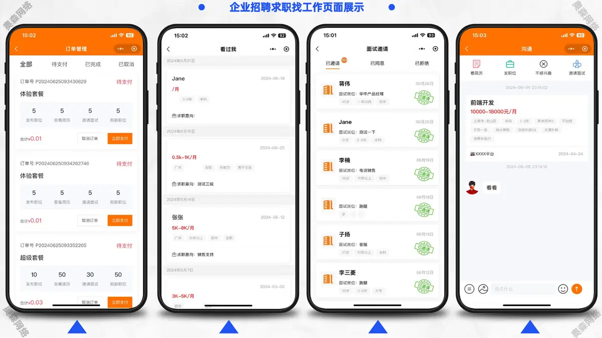 包含微信小程序求职者端、微信小程序企业招聘端、PC企业招聘端、PC管理平台端