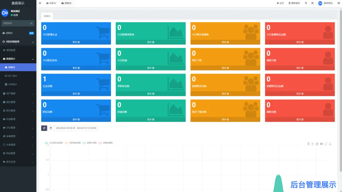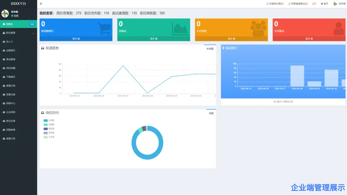 新应聘简历数、待面试简历数、本月应聘数、本月面试数等,投递趋势曲线图