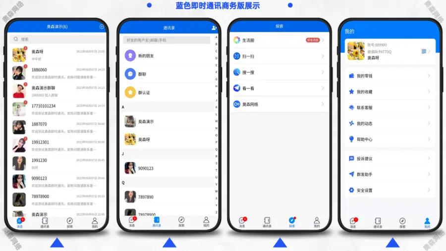 11、支持消息群发功能、一建编辑消息选择好友进行发送、支持反馈投诉功能,后台收到反馈内容、支持在线客服功能、后台设置客服账号