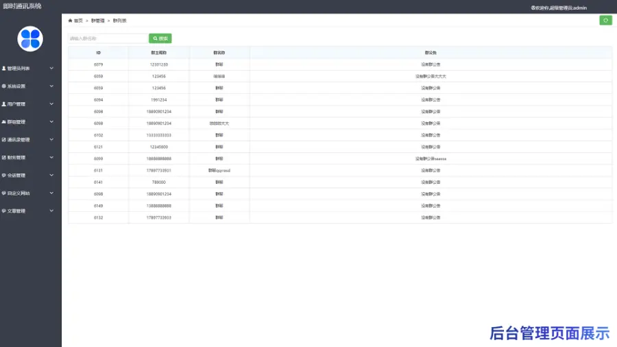 12、后台支持查看详情的用户详情对话、群聊对话、用户管理、管理群聊、网站信息设置、余额管理、文章管理及自定义网站设置